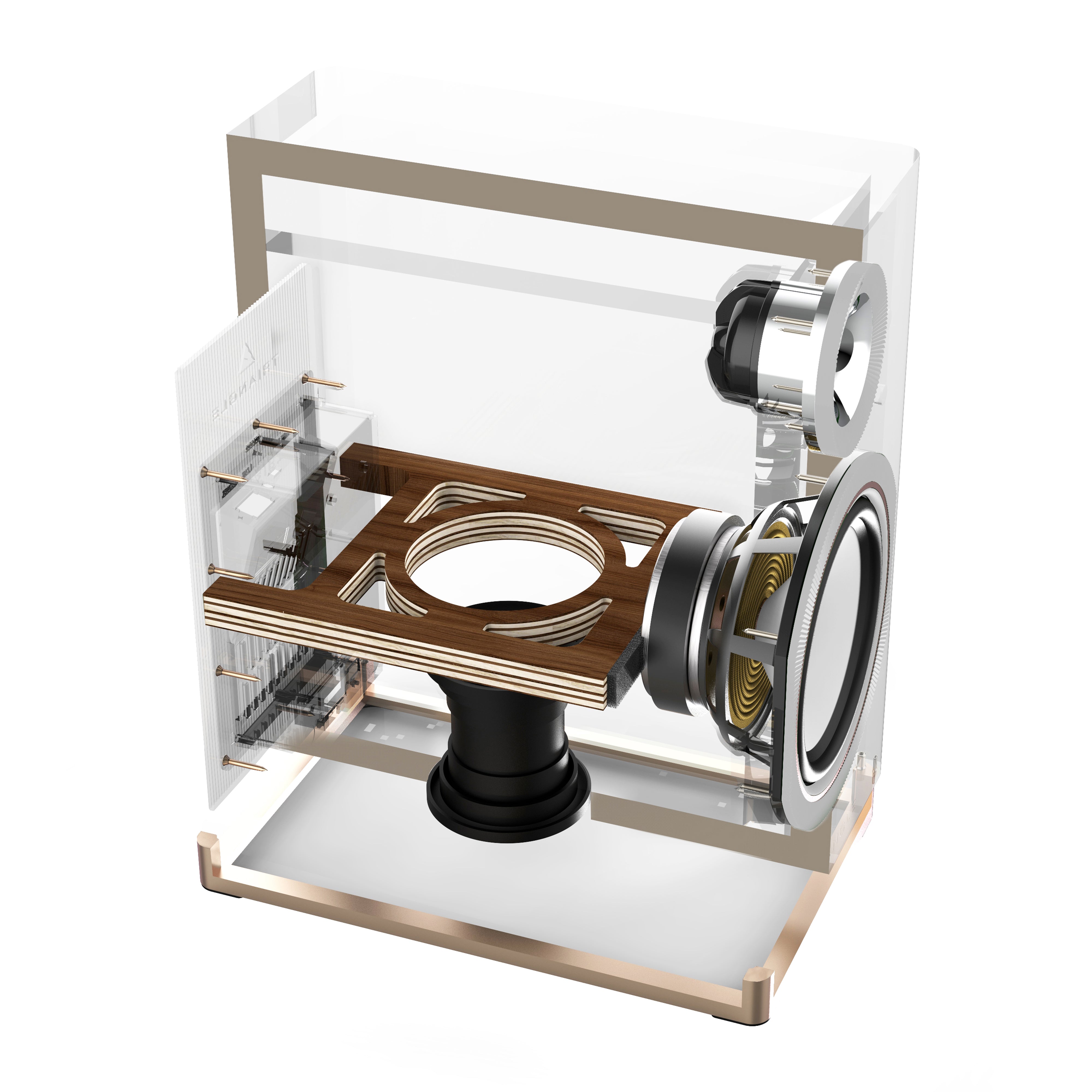 The curved shape of the cabinetry combined with the structured relief of the silicone rings ensures better diffraction of sound waves.